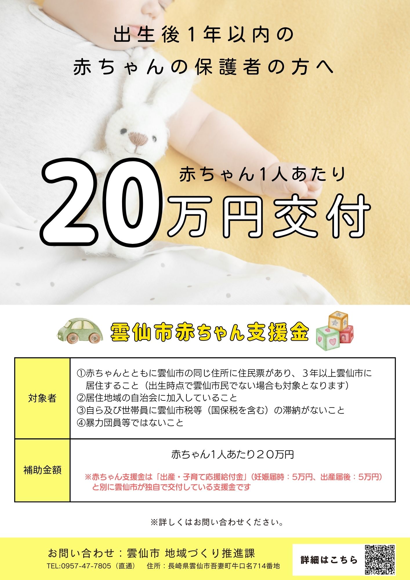 結婚・出産し、雲仙市内に定住される方々の経済的な負担を軽減するため『赤ちゃん支援金』を交付します。